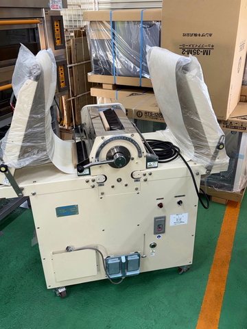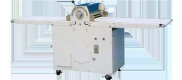 ※生地をコンベアに置き、上下ローラー間を通しながら左右に移動させて徐々にうすく仕上げていきます。